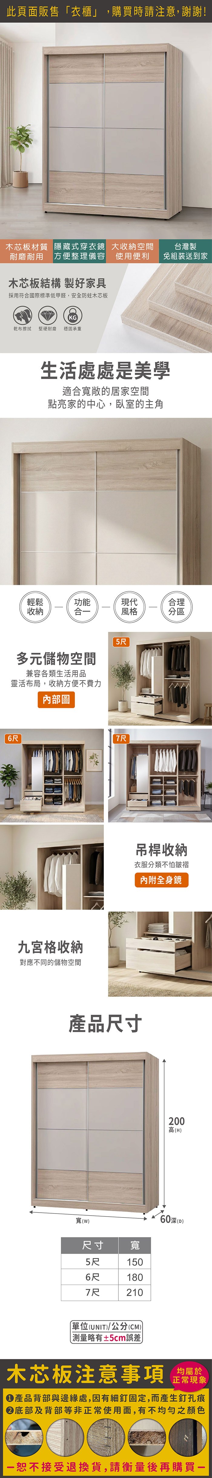簡約北歐風維爾拉5X7尺衣櫃(附側拉鏡)