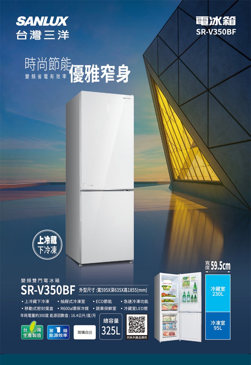 SANLUX台灣三洋325公升雙門琉璃白變頻冰箱SR-V350BF(含標準安裝)