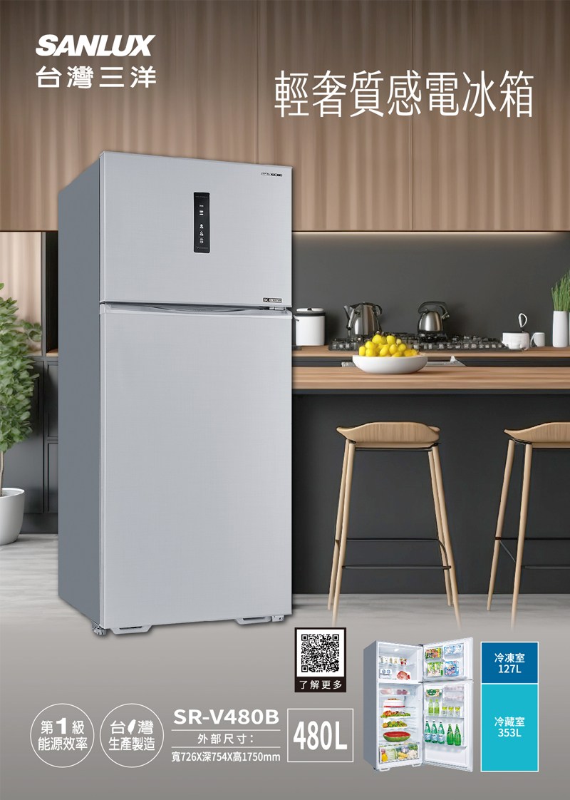SANLUX台灣三洋 480公升雙門變頻光耀銀冰箱SR-V480B