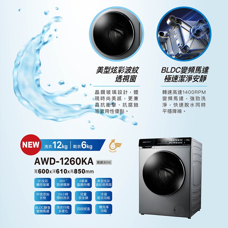 台灣三洋 12公斤變頻洗脫烘滾筒洗衣機AWD-1260KA~含基本安裝