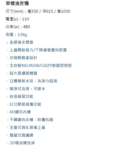 台灣三洋 12公斤定頻直立式洗衣機SW-12NS6A~含基本安裝