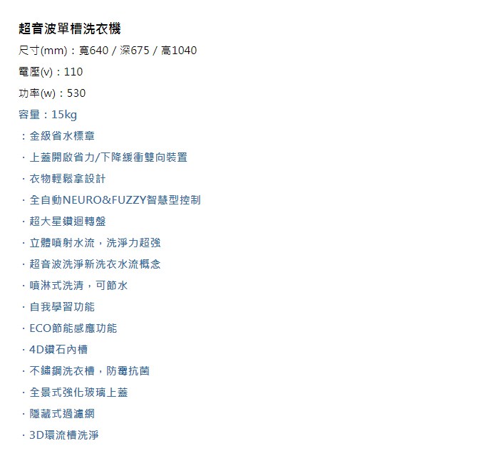 SANLUX 三洋 DD直流變頻超音波單槽洗衣機 SW-15DV10