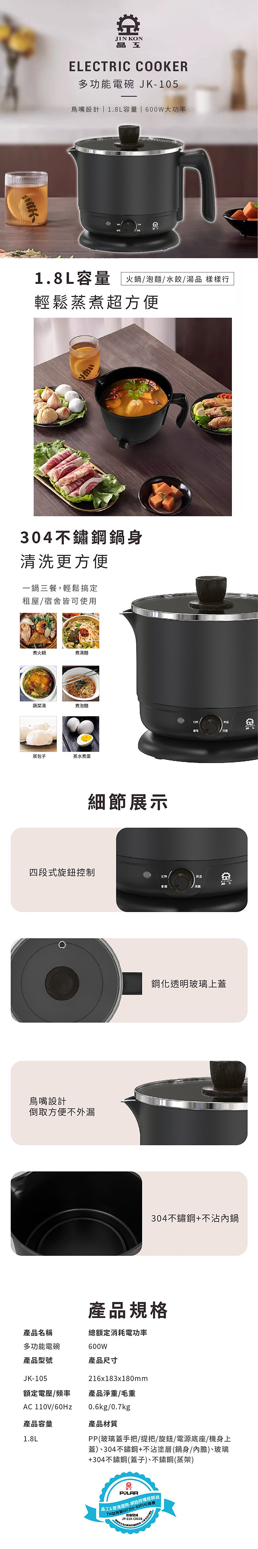 【JINKON 晶工牌】Jinkon晶工 電碗 多功能1.8L JK-105