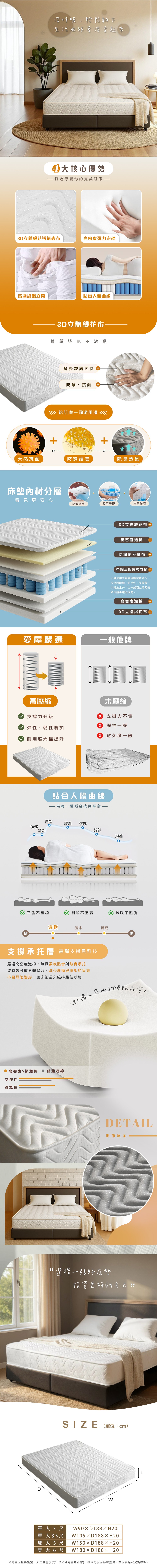 Albert艾柏 抗菌透氣3.5尺單人獨立筒床墊(3.5x6.2尺)-105x188x25cm