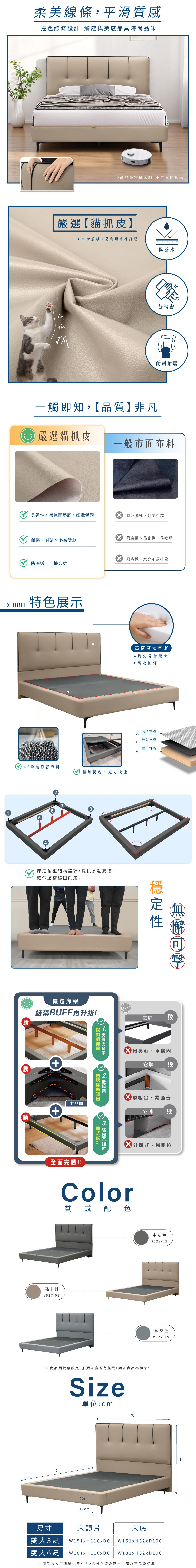 【IDEA】威尼5尺雙人貓抓皮床架/房間2件組(床頭+床底)淺灰色