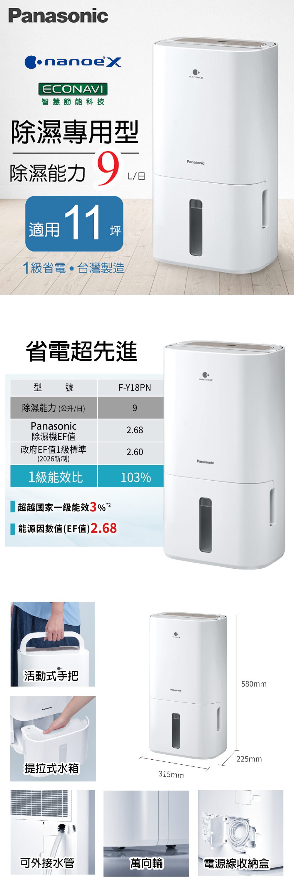 【Panasonic國際牌】9公升nanoeX清淨除濕機 F-Y18PN
