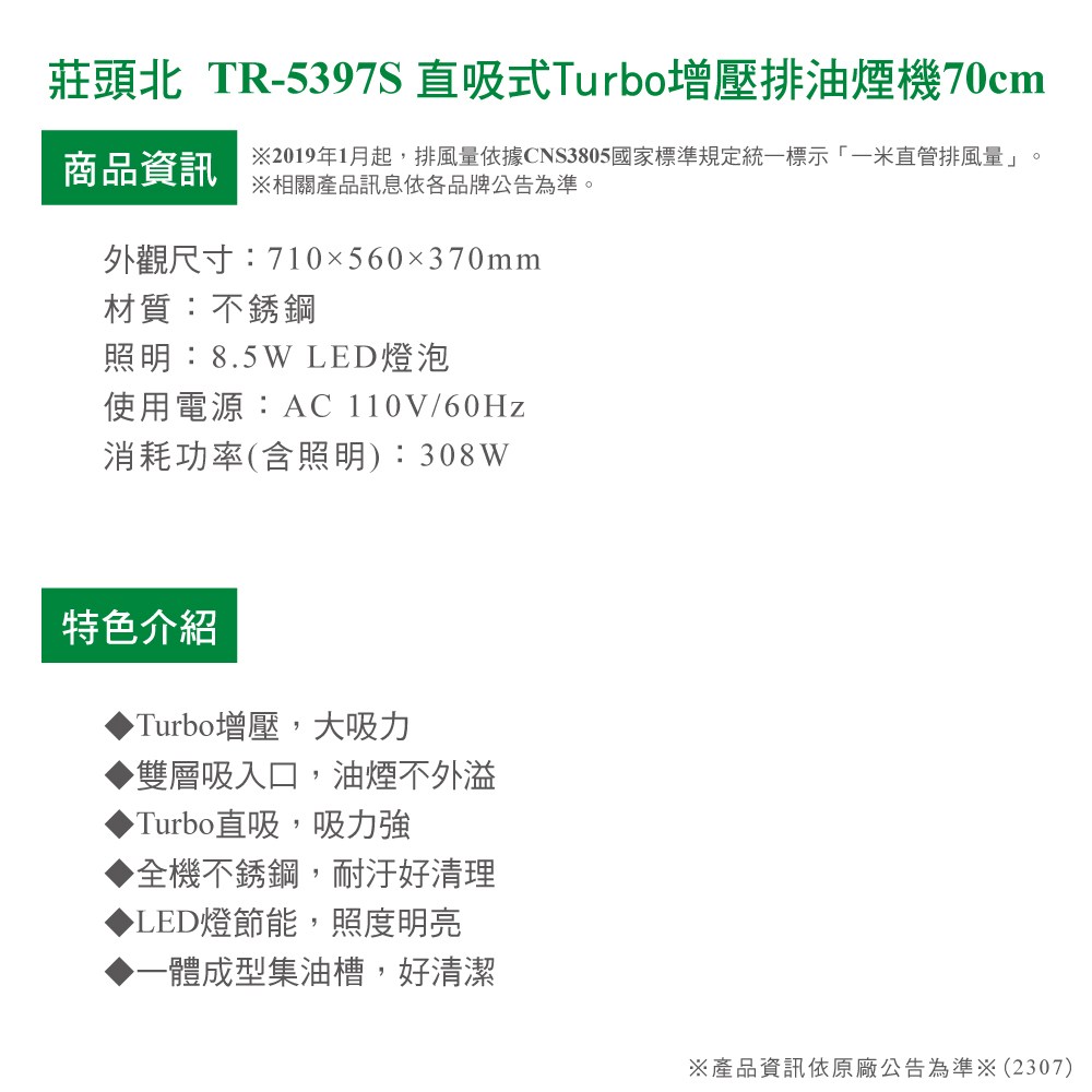 (含基本安裝)莊頭北【TR-5397S】70cmTurbo增壓直吸式斜背排油煙機(不鏽鋼)