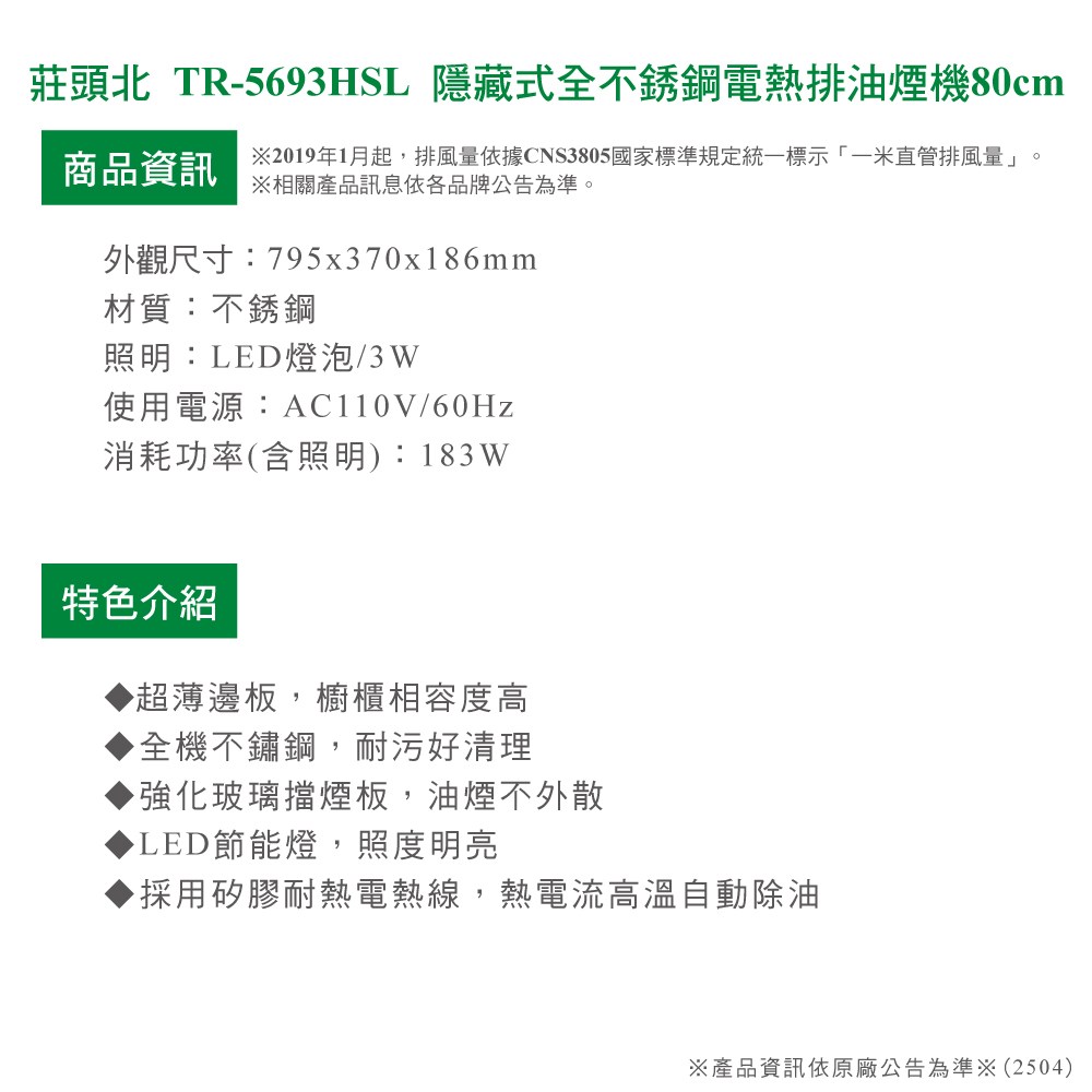 莊頭北 80cm 不鏽鋼 隱藏式 排油煙機 Turbo馬達 TR5697SL