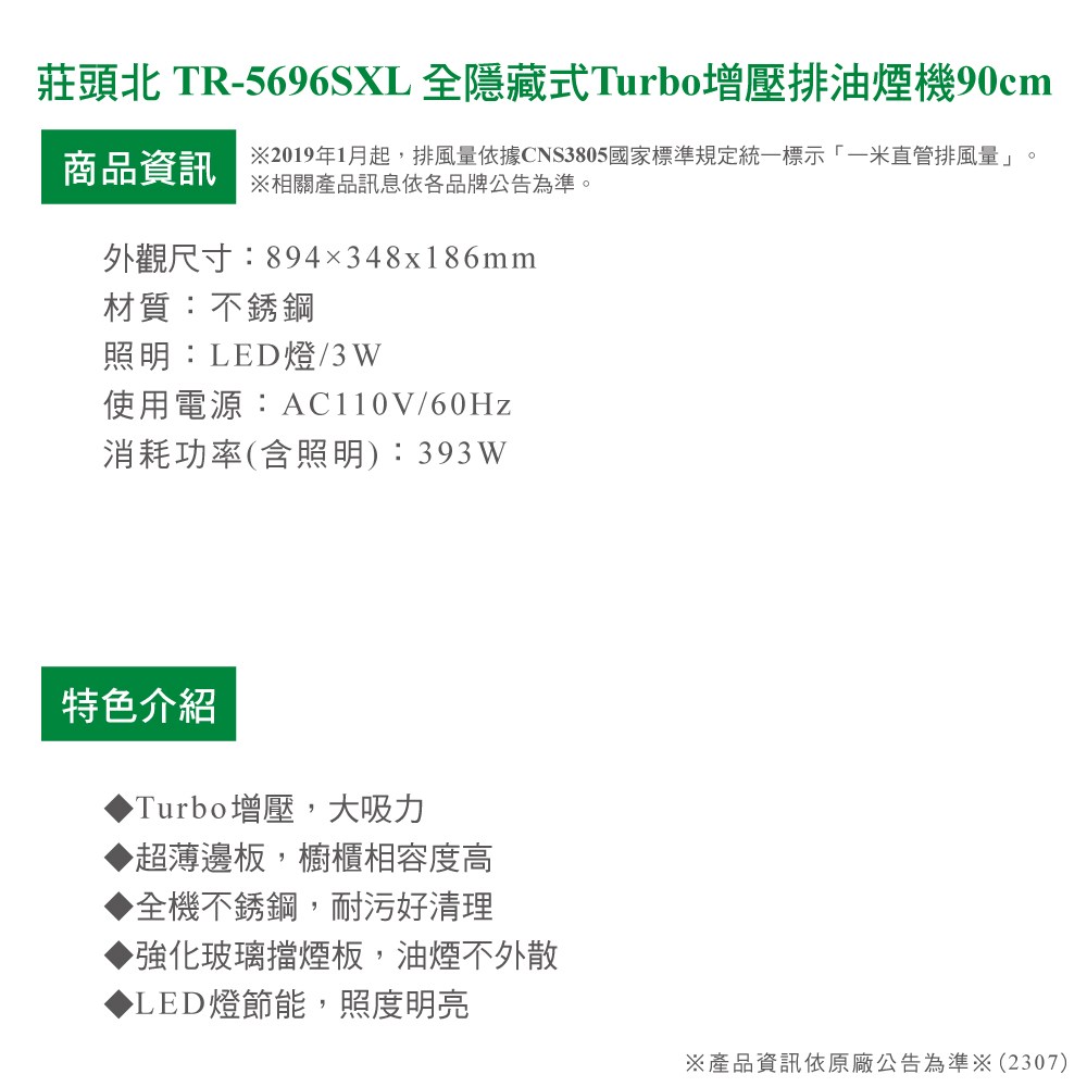 [莊頭北] TR-5698SXL 隱藏式不銹鋼Turbo增壓排油煙機90cm