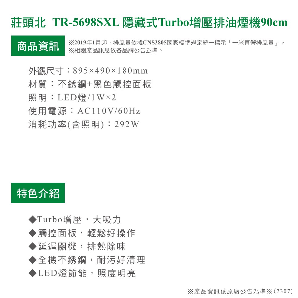 [莊頭北] TR-5698SXL 隱藏式不銹鋼Turbo增壓排油煙機90cm