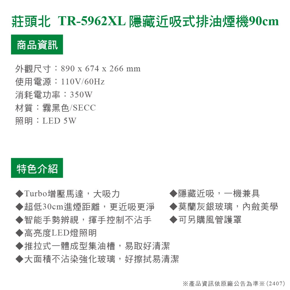 [莊頭北] TR-5962XL 隱藏近吸式排油煙機90cm