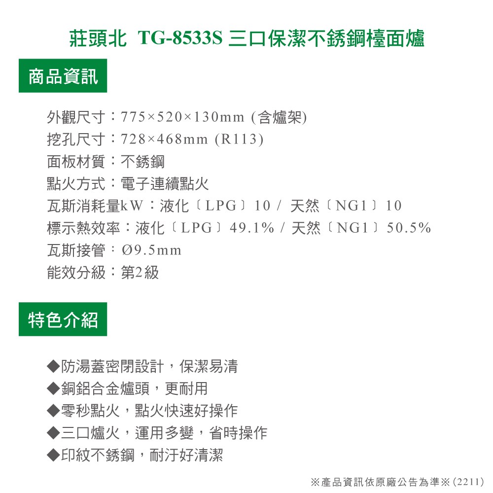 [莊頭北] TG-8533S 三口保潔不銹鋼檯面爐_桶裝LPG桶裝瓦斯(液化)