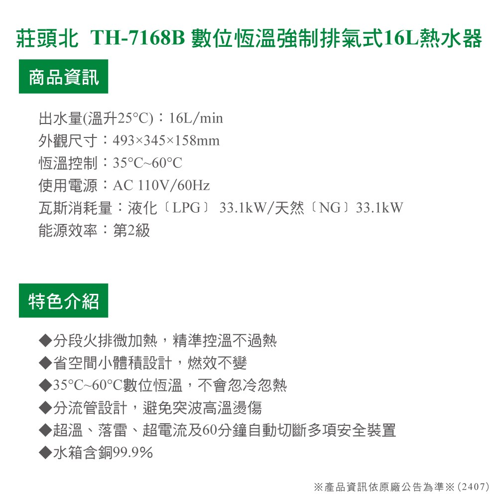 [莊頭北] TH-7168B 數位恆溫強制排氣式16L熱水器_桶裝LPG/FE式桶裝瓦斯(液化)