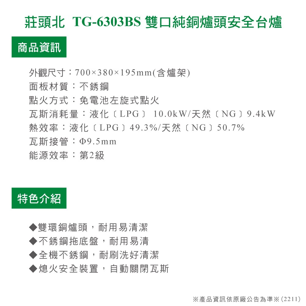 [莊頭北] TG-6303BS 雙口純銅爐頭安全台爐_桶裝LPG桶裝瓦斯(液化)
