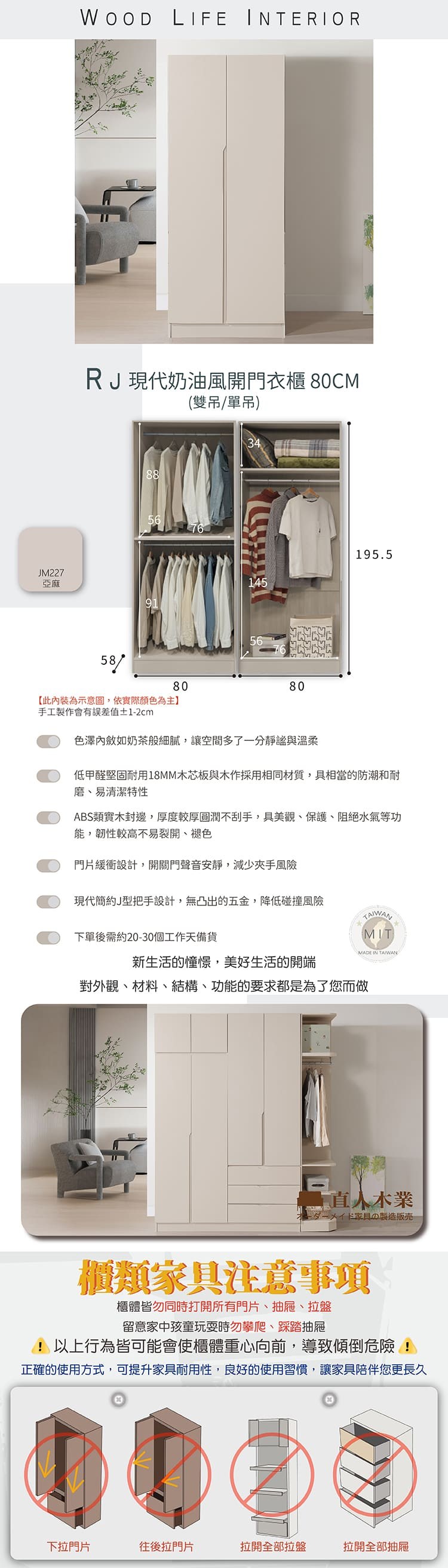 直人木業-RJ現代奶油風長門開門衣櫃組240公分(單吊+雙吊+三抽)