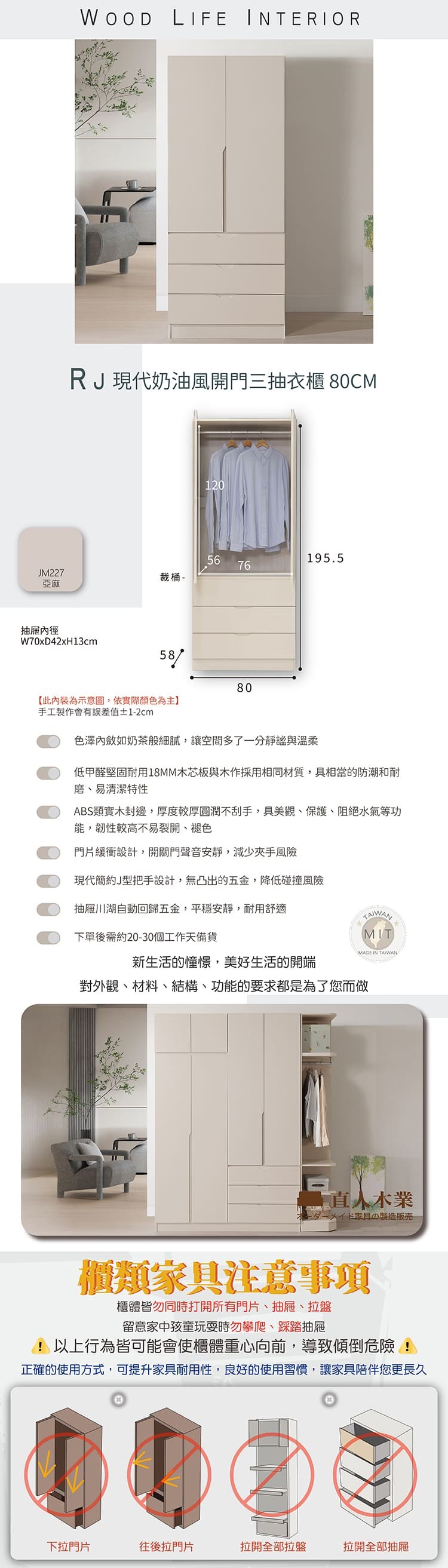 直人木業-RJ北歐奶油風開門三抽衣櫃80公分
