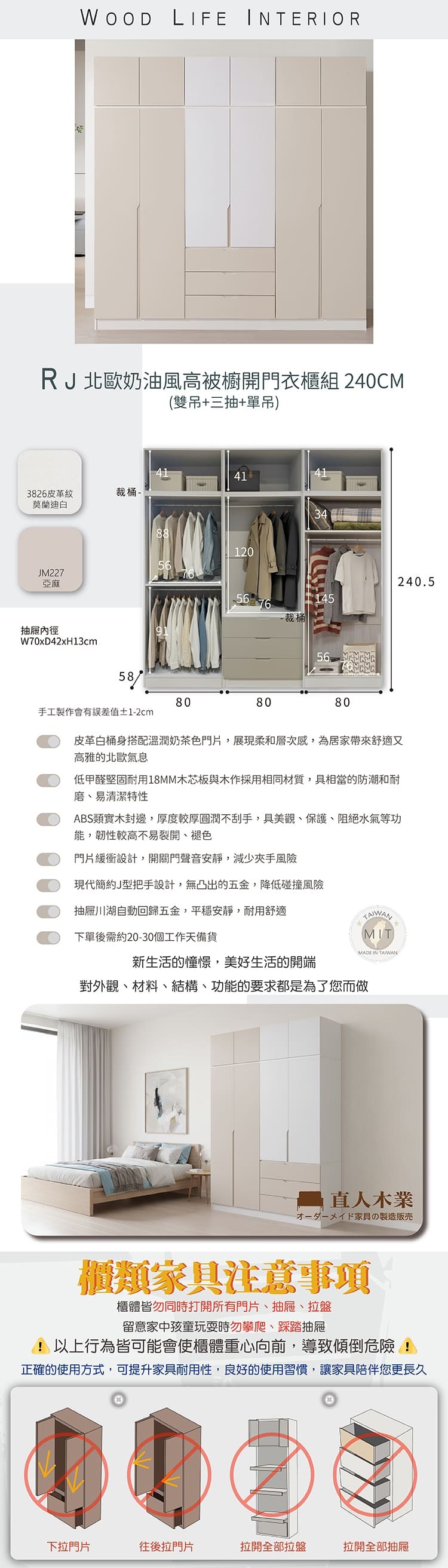 直人木業-RJ現代奶油風長門開門衣櫃組240公分(單吊+雙吊+三抽)