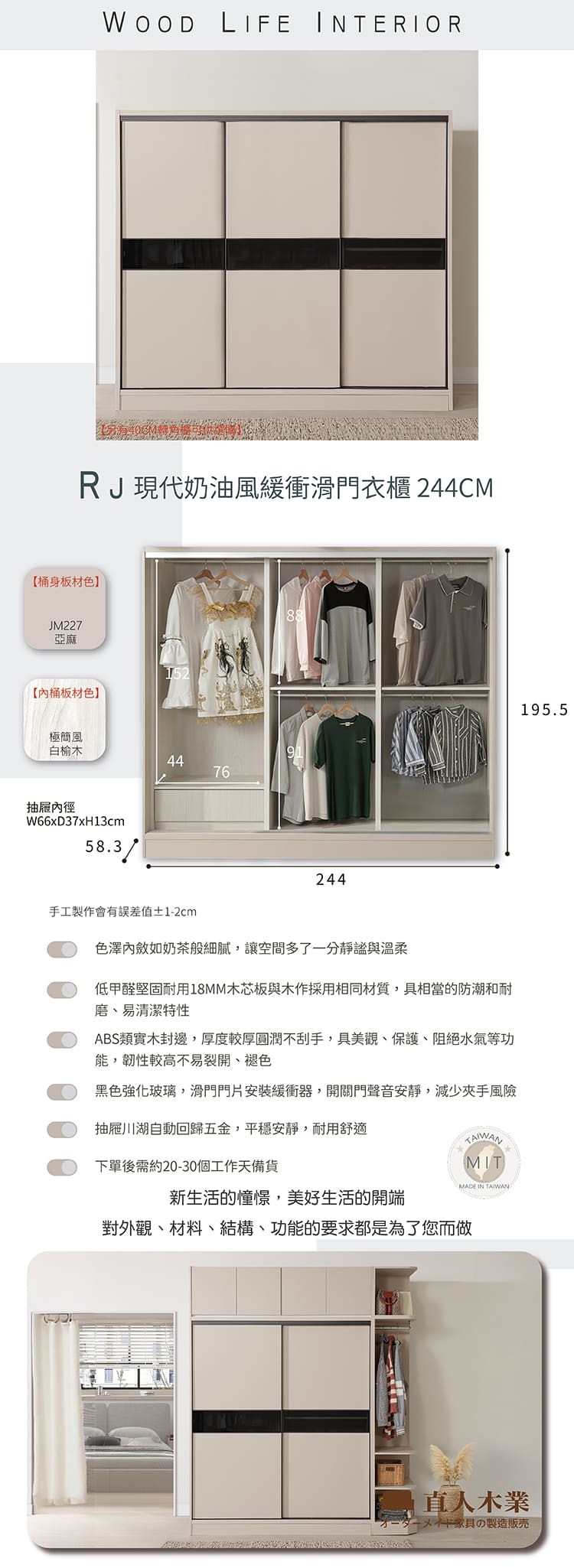 直人木業-RJ現代奶油風緩衝滑門衣櫃244公分