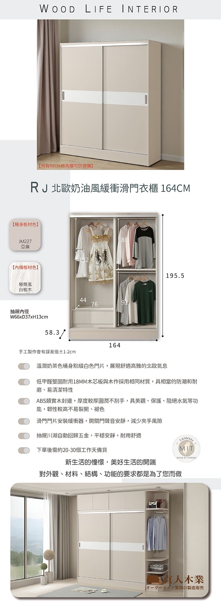 直人木業-RJ北歐奶油風緩衝滑門衣櫃164公分