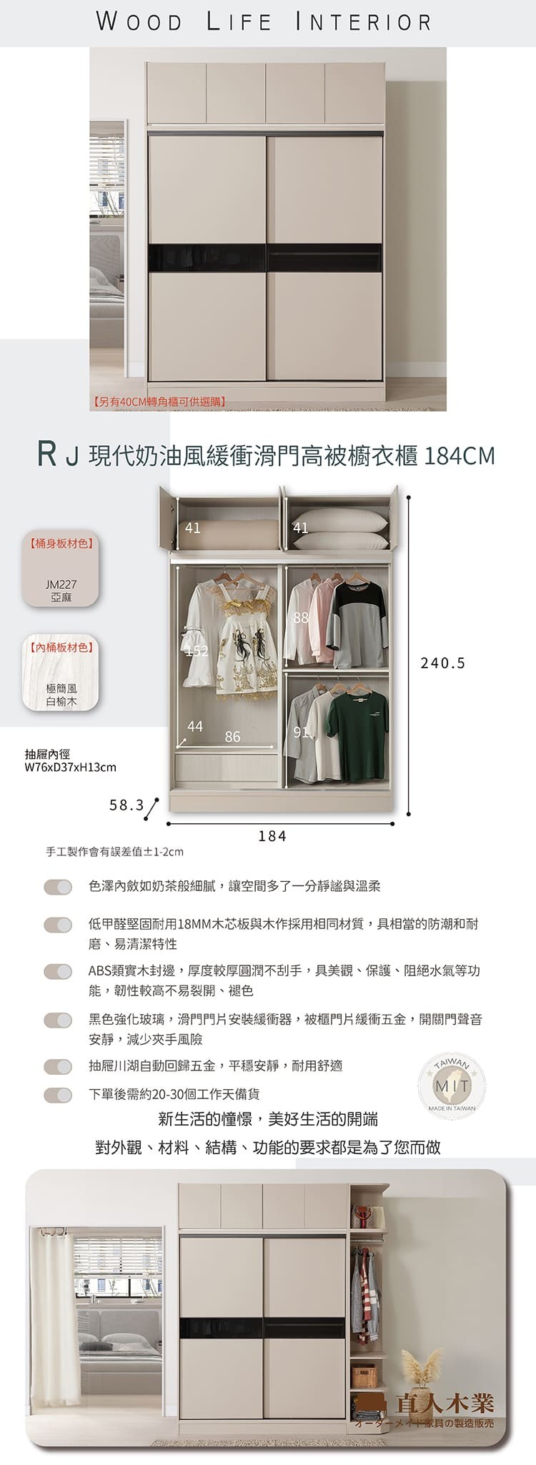 直人木業-RJ現代奶油風緩衝滑門高被櫥衣櫃184公分