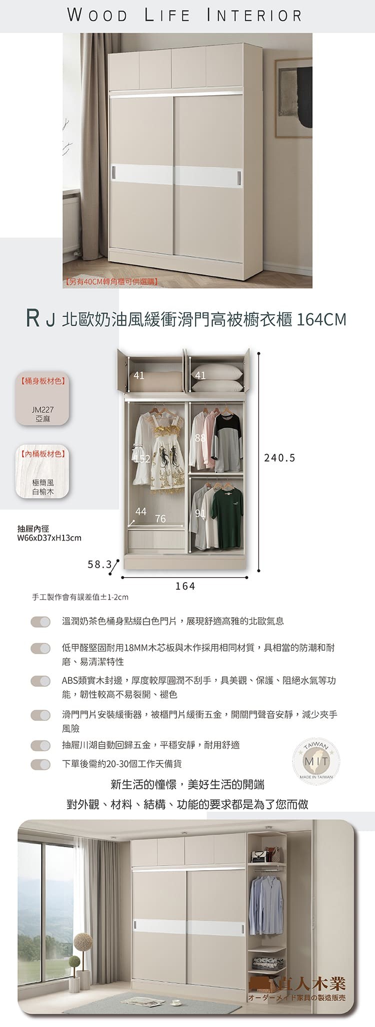 直人木業-RJ北歐奶油風緩衝滑門衣櫃164公分