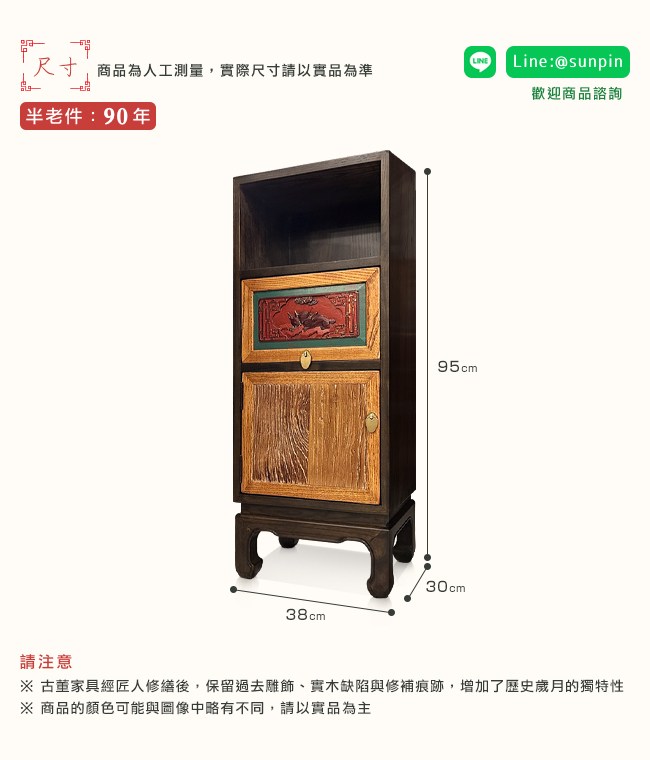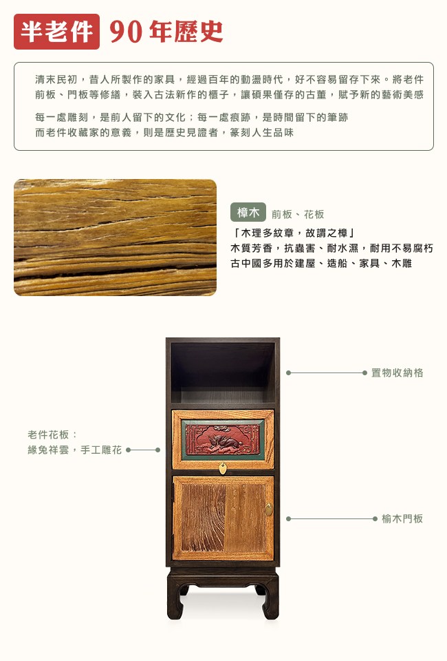 【C'est Chic】蘭亭清泉單格單抽單門實木雕刻櫃(半老件90年)-幅38cm