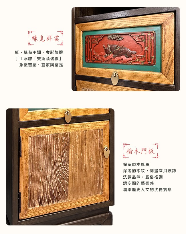 緣兔祥雲的古法手工雕板,以紅、綠為主調,金彩飾邊,浮雕著「雙兔踏瑞雲」,象徵吉慶、宜家與富足。下方的榆木門板,保留原木風貌。深邃的木紋,刻畫歲月痕跡,洗鍊品味,脫俗格調,讓空間的藝術感,增添歷史人文的沈穩氣息。