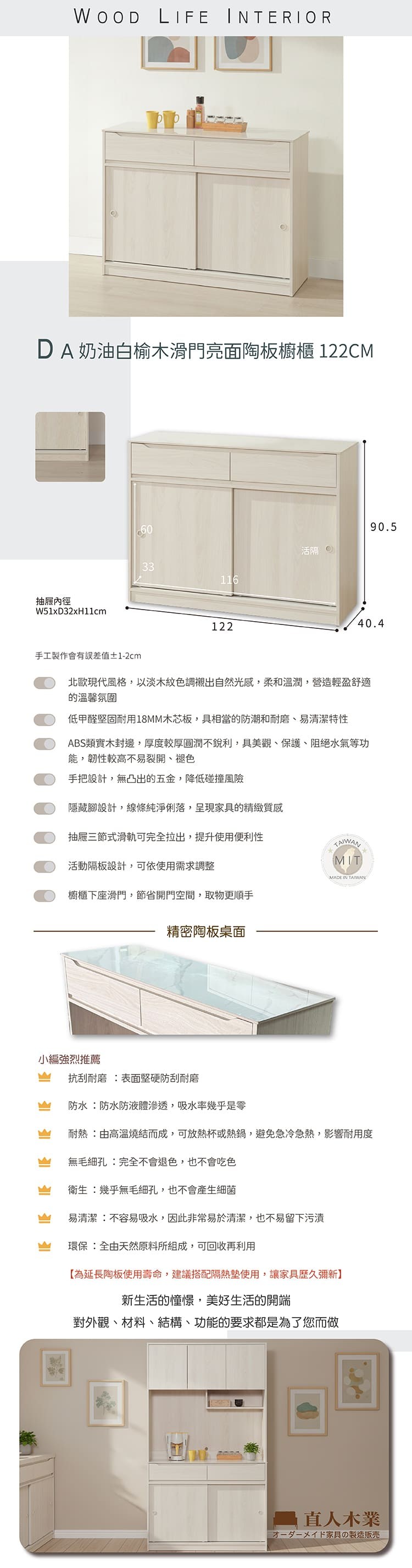 直人木業-DA奶油白榆木亮面陶板滑門櫥櫃122公分