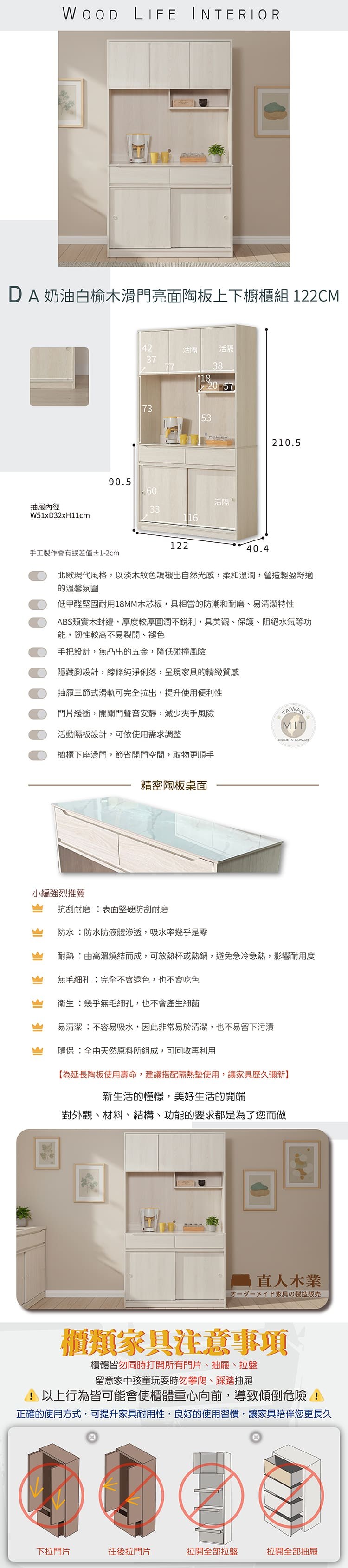 直人木業-DA奶油白榆木亮面陶板拉盤上下櫥櫃組122公分