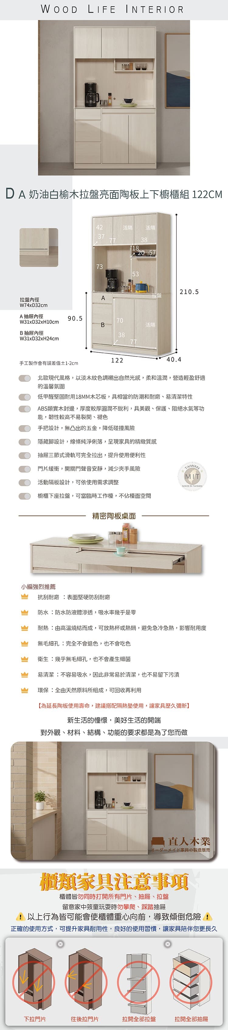 直人木業-DA奶油白榆木亮面陶板拉盤上下櫥櫃組122公分