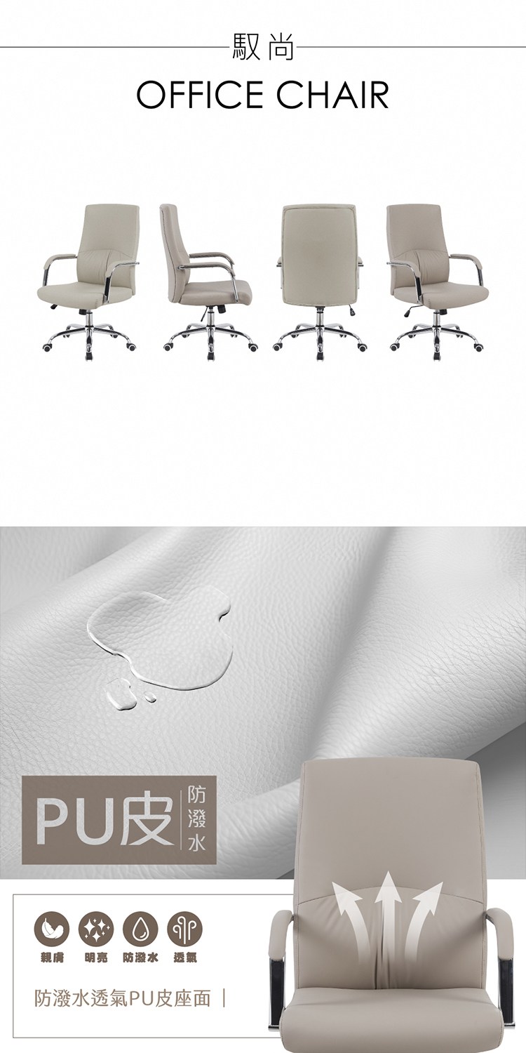 * 防潑水PU皮座面,觸感佳易清潔