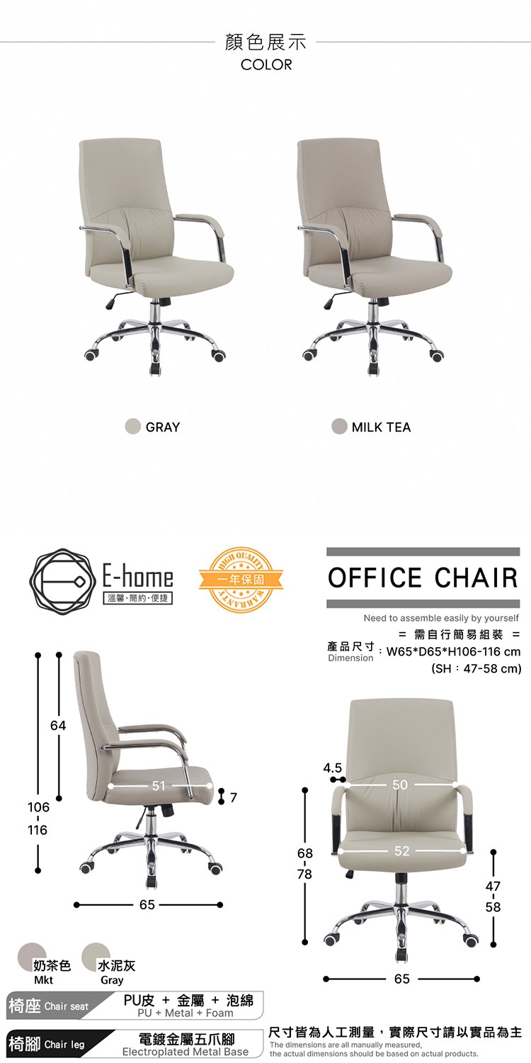 材質:PU皮 + 泡棉 + 電鍍金屬五爪腳 + PU滑輪