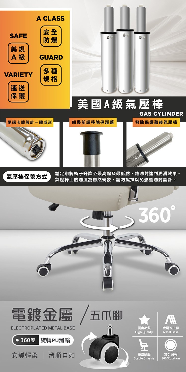 外拉開啟椅背傾仰,可舒適休憩,配備美規A級氣壓棒、安全升降,採用電鍍金屬五爪腳,穩固耐用,