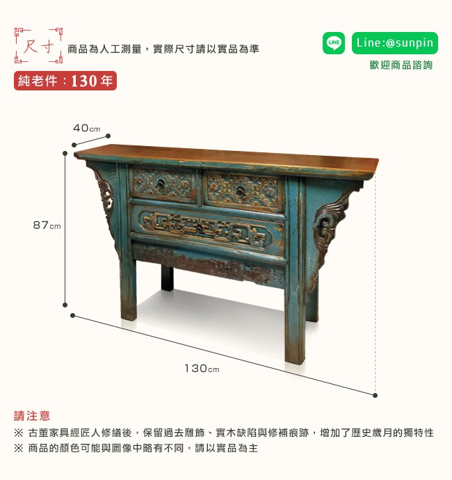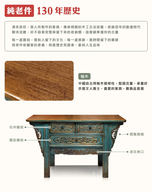 清末民初,昔人所製作的家具,傳承明朝的木工古法技藝。經過百年的動盪時代,顛沛流離,好不容易完整保留下來的收納櫃,這是碩果僅存的古董。每一處雕刻,是前人留下的文化;每一處痕跡,是時間留下的筆跡。而老件收藏家的意義,則是歷史見證者,篆刻人生品味。