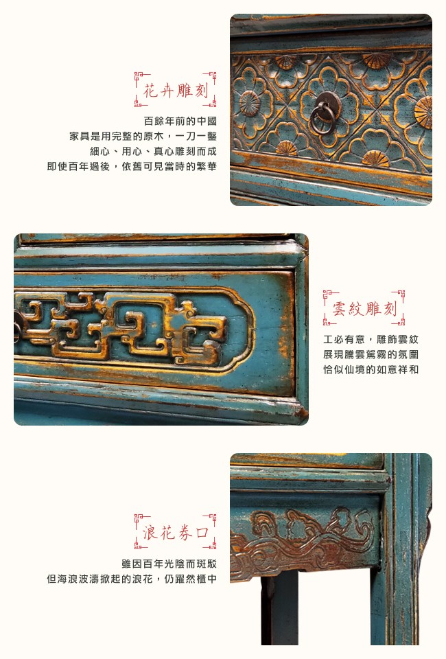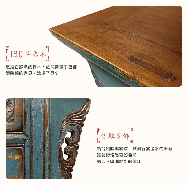 歷經百餘年的榆木,歲月刻畫了痕跡,讓陳舊的家具,沈浸了歷史。「透雕裝飾」結合翅膀與雲紋,雕刻行雲流水的美感,讓藝術增添奇幻色彩,猶如《山海經》的帝江。「花卉雕刻」百餘年前的中國,家具是用完整的原木,一刀一鑿,細心、用心、真心雕刻而成,即使百年過後,依舊可見當時的繁華。「雲紋雕刻」工必有意,雕飾雲紋展現騰雲駕霧的氛圍,恰似仙境的如意祥和。「浪花券口」雖因百年光陰而斑駁,但海浪波濤掀起的浪花,仍躍然櫃中。