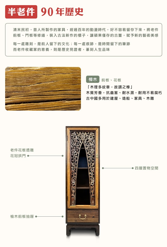 清末民初,昔人所製作的家具,經過百年的動盪時代,好不容易留存下來。將老件前板、門板等修繕,裝入古法新作的櫃子,讓碩果僅存的古董,賦予新的藝術美感。每一處雕刻,是前人留下的文化;每一處痕跡,是時間留下的筆跡。而老件收藏家的意義,則是歷史見證者,篆刻人生品味。
