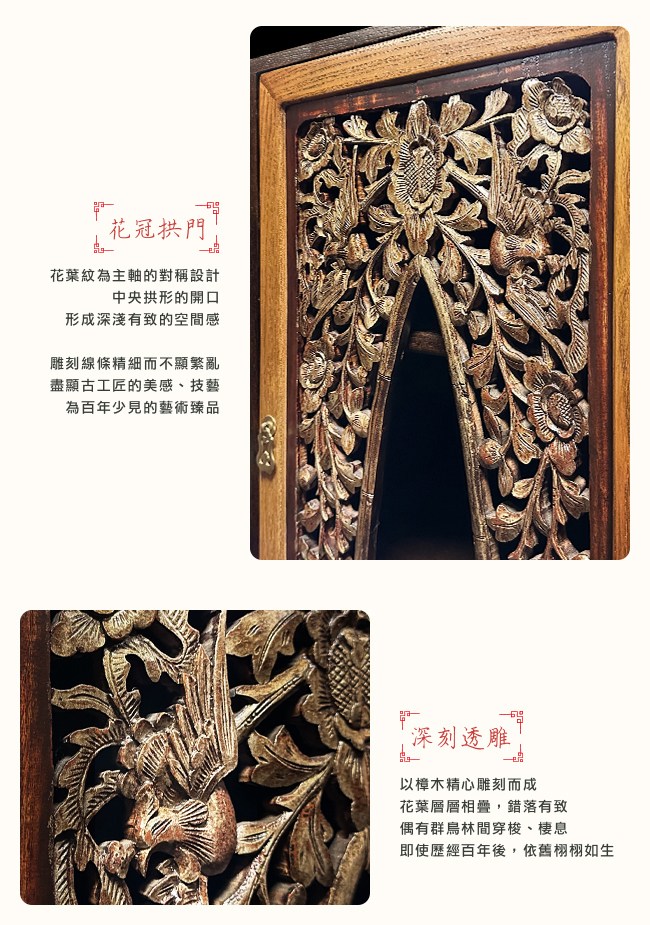 花冠拱門的古法手工雕板,花葉紋為主軸的對稱設計,中央拱形的開口,形成深淺有致的空間感。雕刻線條精細而不顯繁亂,盡顯古工匠的美感、技藝,為百年少見的藝術臻品。以樟木精心雕刻而成,花葉層層相疊,錯落有致,偶有群鳥林間穿梭、棲息。即使歷經百年後,依舊栩栩如生。下方的榆木前板抽屜,保留原木風貌。深邃的木紋,刻畫歲月痕跡,洗鍊品味,脫俗格調,讓空間的藝術感,增添歷史人文的沈穩氣息。