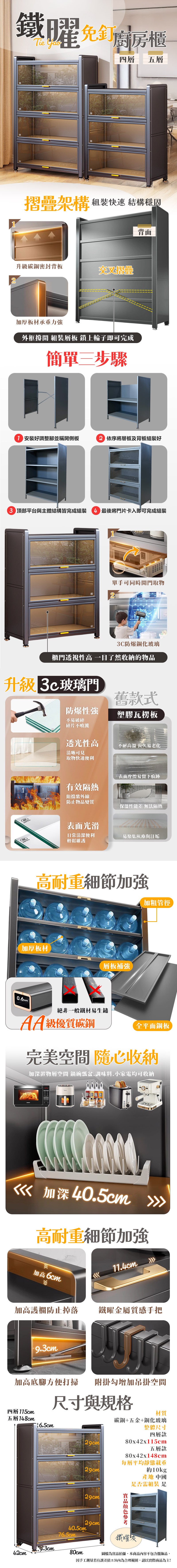 【居家cheaper】鐵曜加深免螺絲玻璃四層廚房櫃 KG0680-4BK四層款