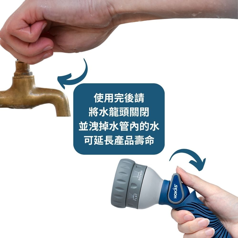 *水管使用完畢後,請將管內剩餘的水量釋出,收納時放置於陰涼通風處風乾,請勿讓管內長時間積水,易產生發霉。