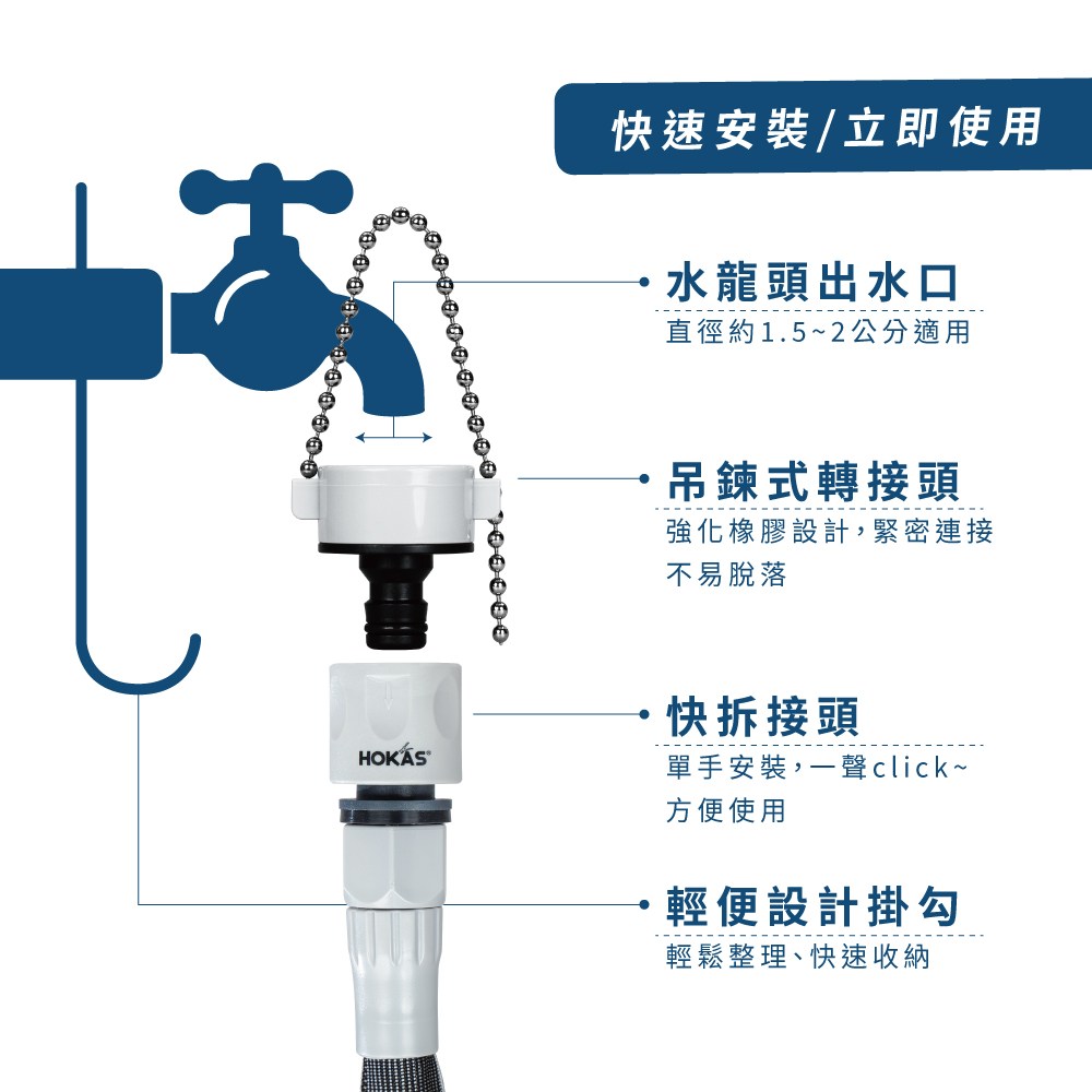 • 附專屬掛勾,使用完畢後即可將水管掛起來晾乾,收納簡便且不易造成摺痕,解決傳統水管收納不當造成出水不順的問題。