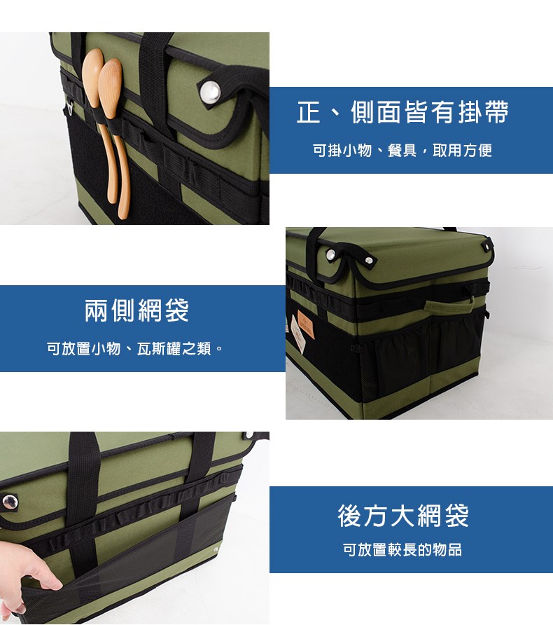 ◆ 側邊網袋+掛帶設計:可放小物、瓦斯罐、燈具,取用更方便