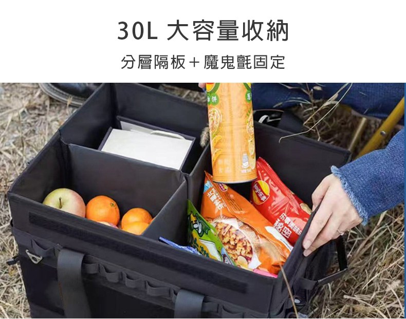 ◆ 30L 大容量收納:可放衣物、露營器材、鍋具與餐具,滿足出行所需