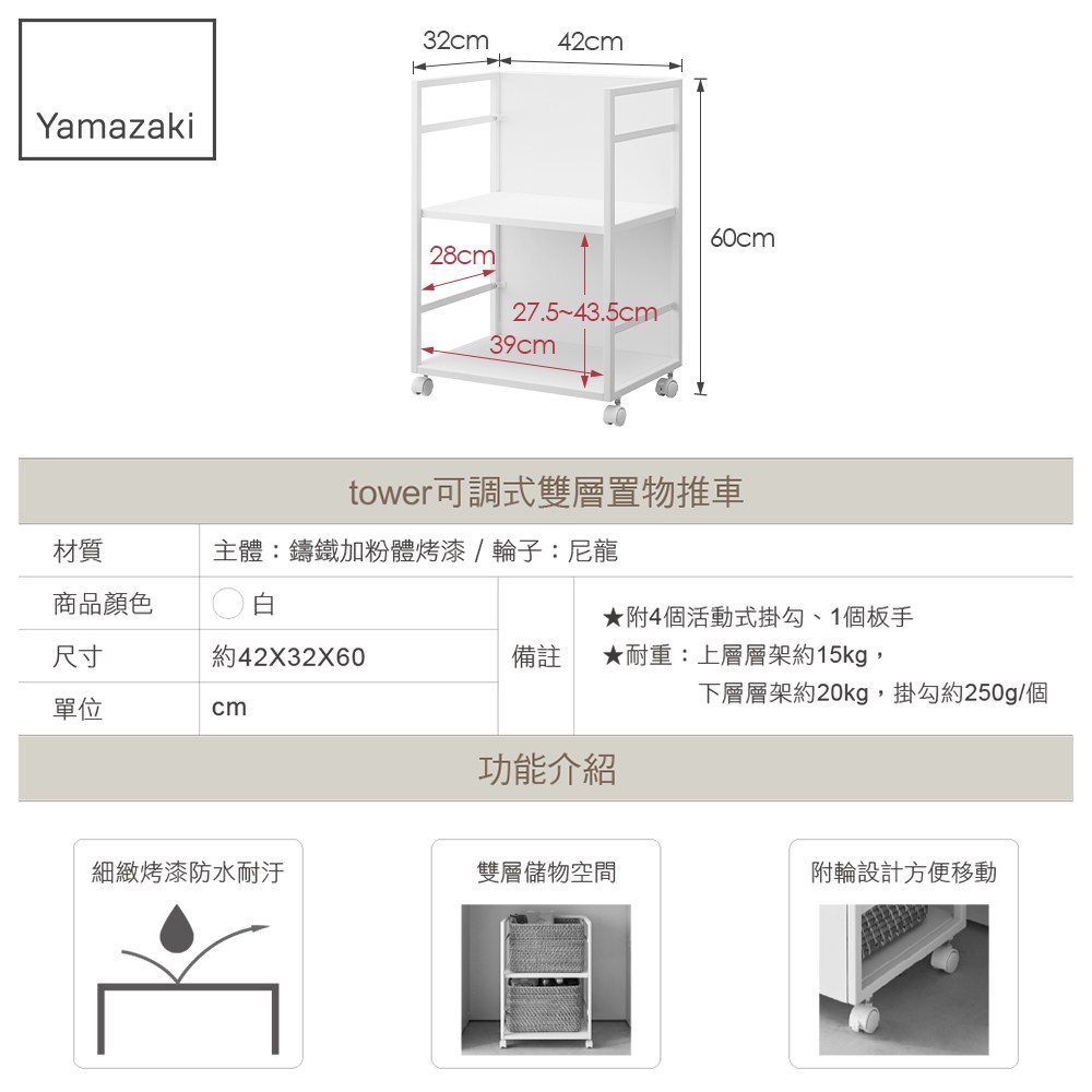 ★耐重:上層層架約15kg,下層層架約20kg,掛勾約250g/個