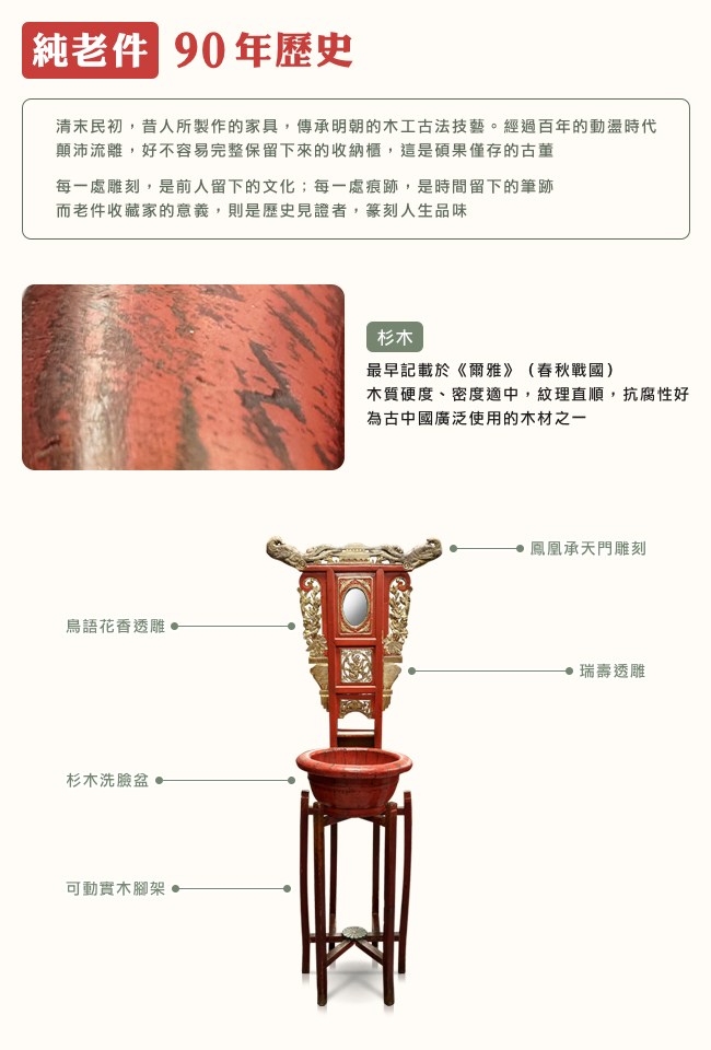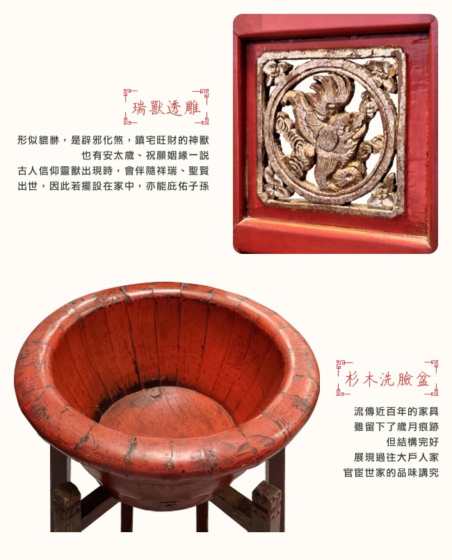 歷經近百年的杉木,歲月刻畫了痕跡,讓陳舊的家具,沈浸了歷史。「鳳凰承天門雕刻」百年前的工匠精雕細琢,重現出氣勢宏偉的城門,寓意「奉天承運,受命於天」。左右雕飾鳳凰,象徵夫妻和睦,一生相伴。「鳥語花香」將中國丹青特有的花鳥圖。以透雕形式表現在鎮邊上,光影深淺漸變化,空間層次有深度,品味脫俗,意境優美。「瑞獸透雕」形似貔貅,是辟邪化煞,鎮宅旺財的神獸,也有安太歲、祝願姻緣一說,古人信仰靈獸出現時,會伴隨祥瑞、聖賢出世,因此若擺設在家中,亦能庇佑子孫。