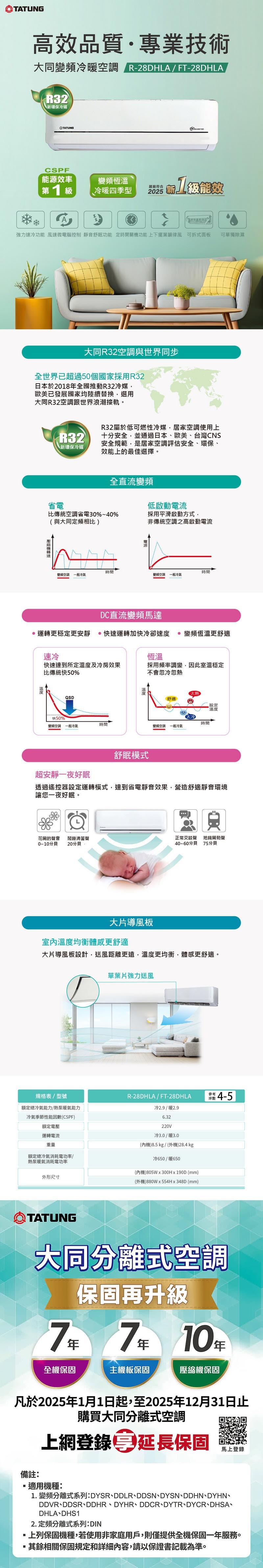 TATUNG大同 4-5坪一級能效變頻冷暖分離式冷氣 R-28DHLA+FT-28DHLA~含基本安裝+舊機回收