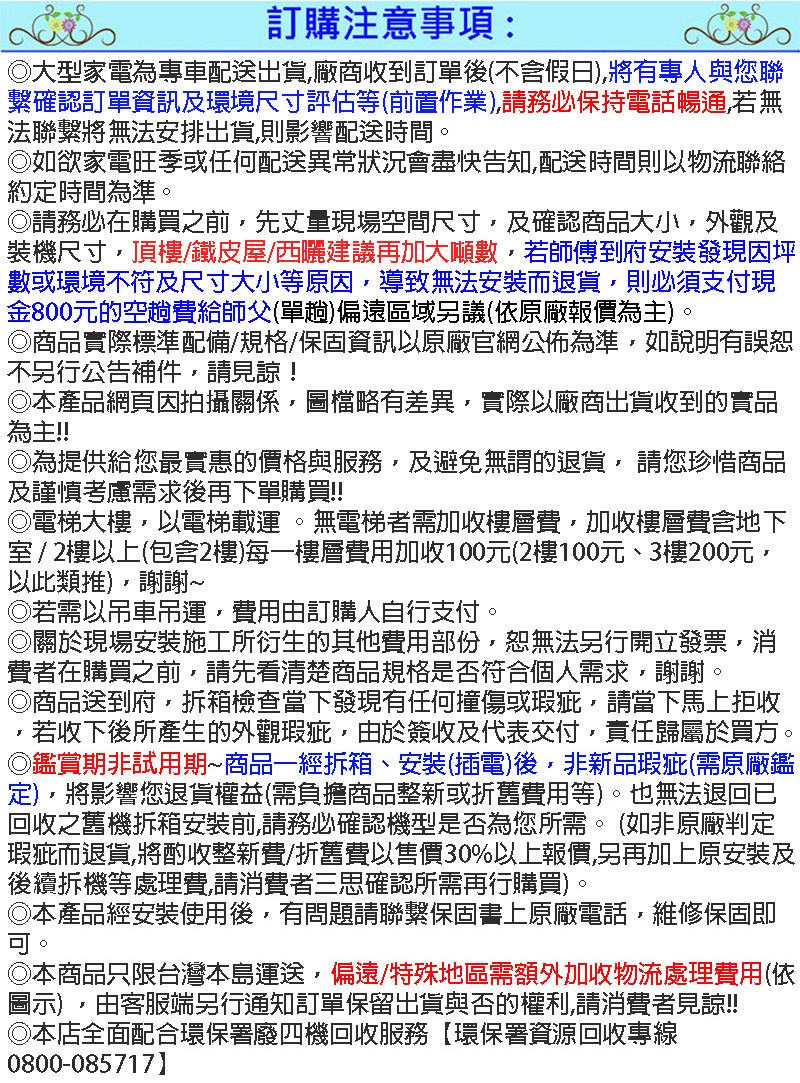 ◎請務必在購買之前,先丈量現場空間尺寸,及確認商品大小,外觀及裝機尺寸,頂樓/鐵皮屋/西曬建議再加大噸數,若師傅到府安裝發現因坪數或環境不符及尺寸大小等原因,導致無法安裝而退貨,則必須支付現金800元的空趟費給師父(單趟)偏遠區域另議(依原廠報價為主)。