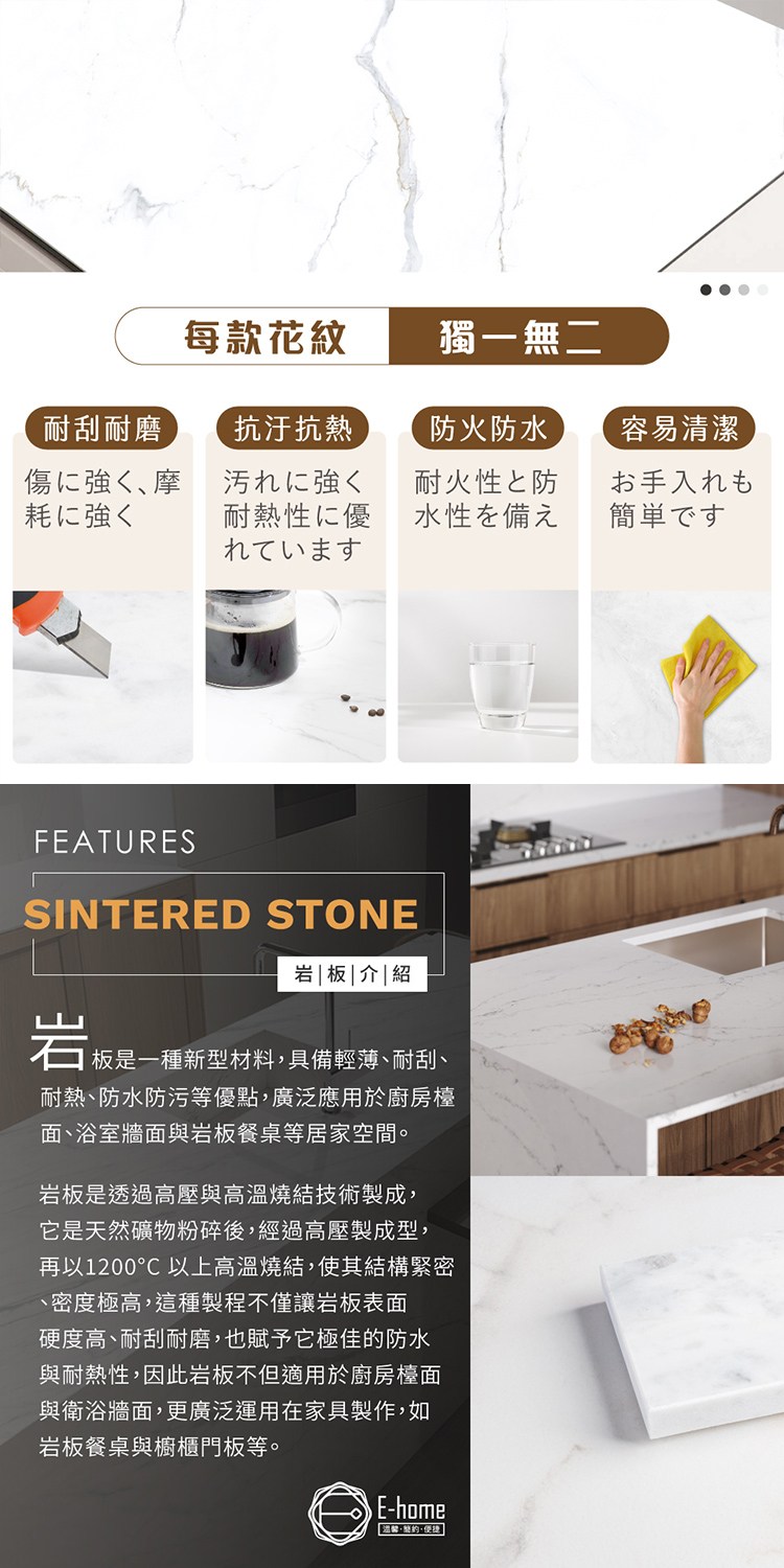 台灣與歐美同步販售、美規設計,嚴選白色拋光岩板桌面美觀質感,每款花紋獨特防潑水外也易清潔,