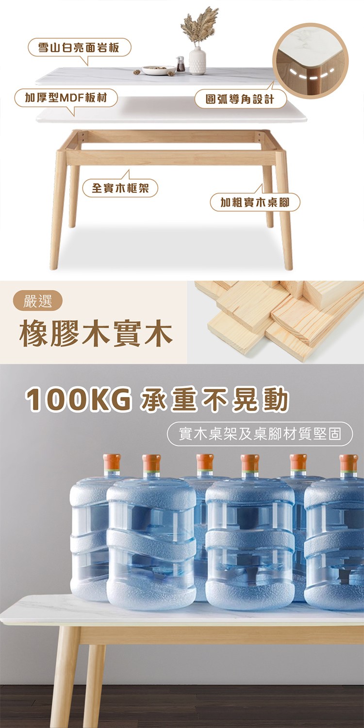 四邊桌角設計為圓弧導角更安全,下方貼合加厚MDF板材承重更佳,橡膠木實木桌架及桌腳材質堅固,