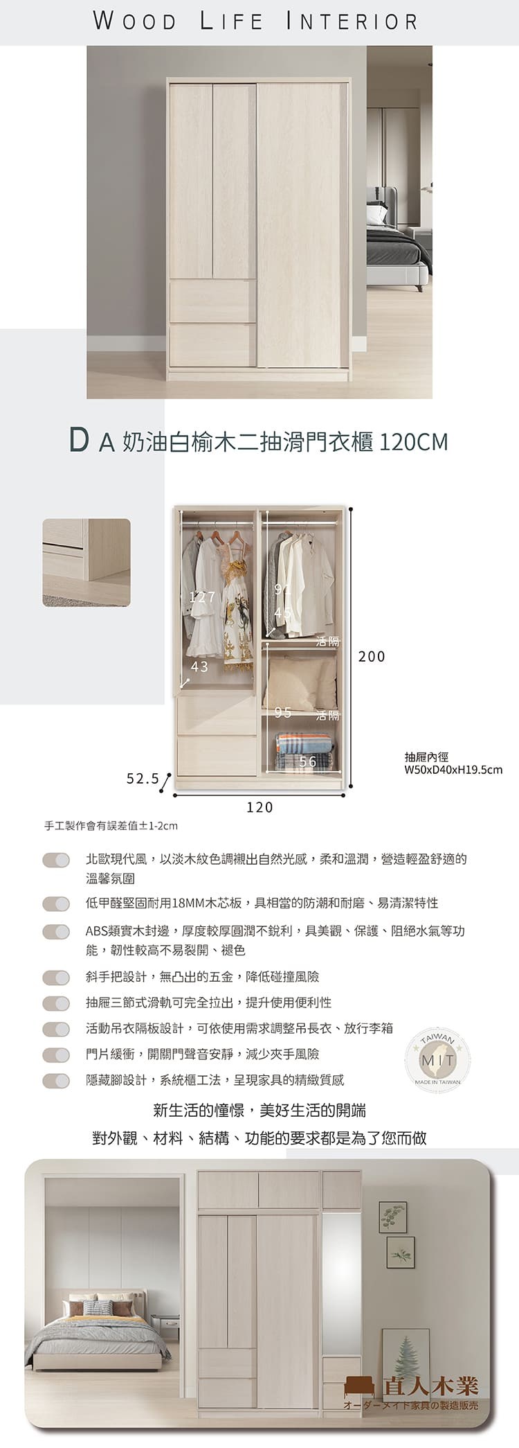 直人木業-DA奶油白榆木二抽滑門衣櫃120公分