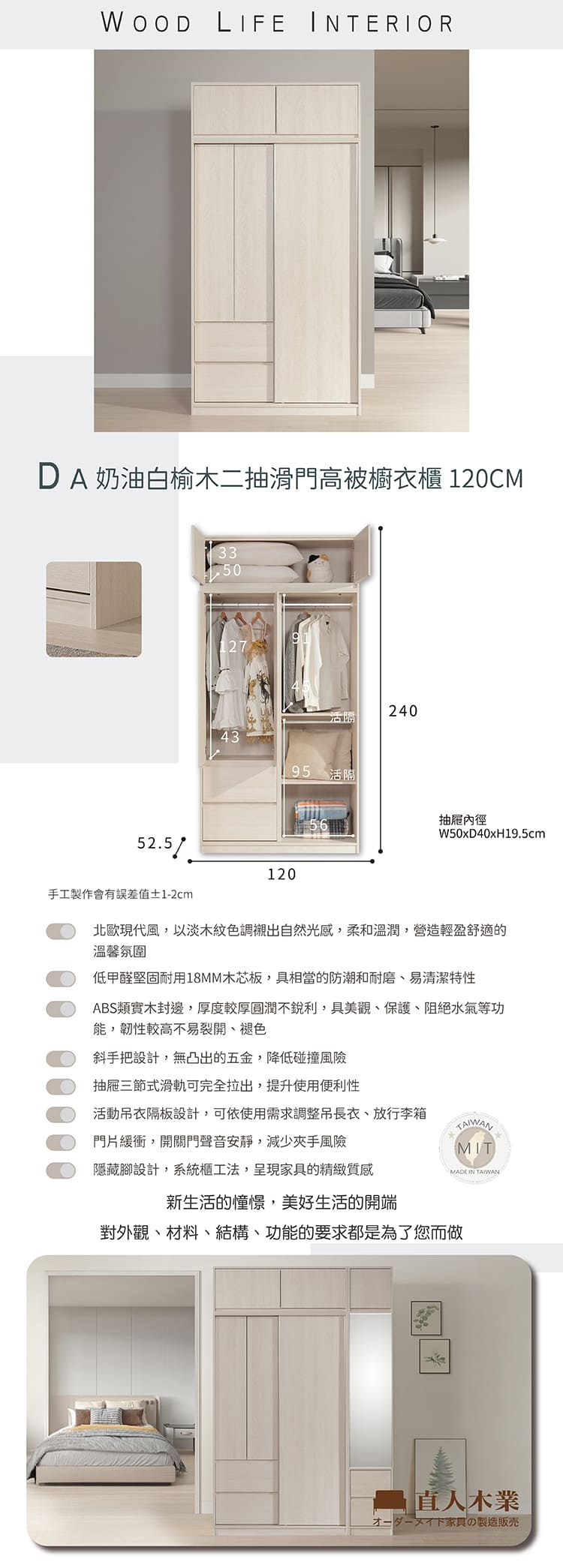 直人木業-DA奶油白榆木三抽滑門高被櫥衣櫃120公分